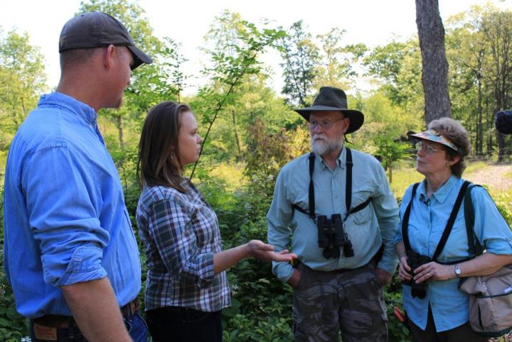 Left to right: USDA Natural Resources Conservation Service District Conservationist Brad Michael and Emily Heggenstaller, a golden-winged warbler biologist, meet with private landowners Mike and Laura Jackson to discuss young forest habitat management on their property. Photo by Justin Fritscher.