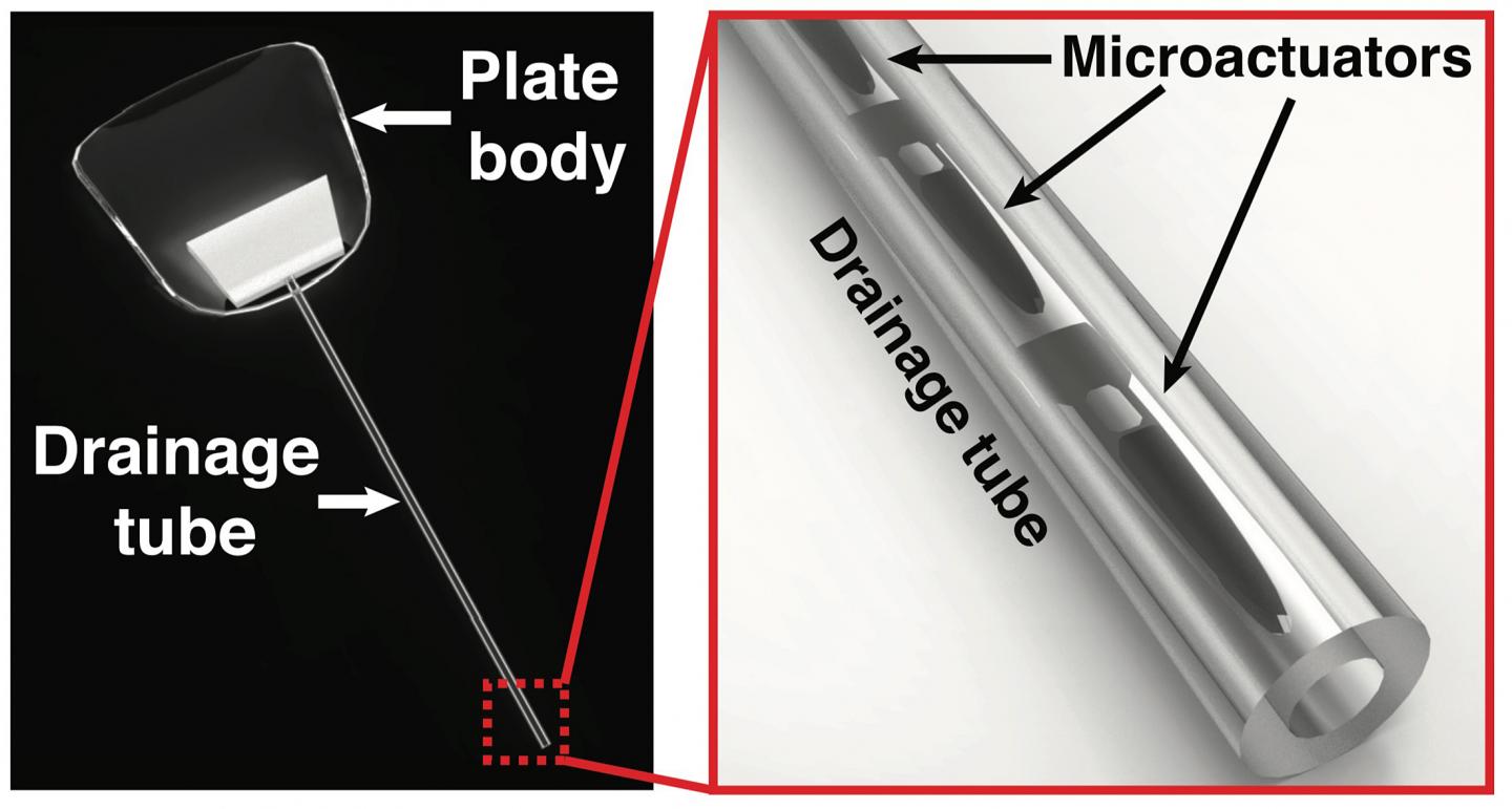The Purdue glaucoma drainage device is built with microactuators that vibrate when a magnetic field is introduced. The vibrations shake loose the biomaterials that have built up in the tube.