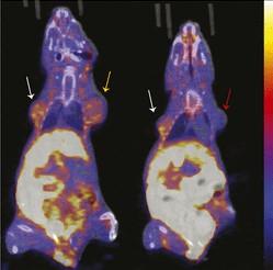 image: Representative coronal 18F-FFNP PET/CT images of MDA-MB-231 (red arrow), 231 PR-A (white arrows), and 231 PR-B (yellow arrow) tumor xenografts (19 d after implantation) from 12 mice imaged 1 h after injection with 10 MBq (270 μCi) of 18F-FFNP. Physiologic uptake from hepatobiliary clearance is also visualized.