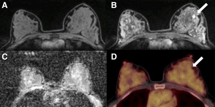 image: A 50-y-old postmenopausal woman with fibroadenoma (arrows) in left breast. (A) Unenhanced fat-saturated T1-weighted MRI shows extreme amount of FGT (ACR d). (B) Moderate BPE is seen on dynamic contrast-enhanced MRI at 90 s. (C) Mean ADC of breast parenchyma of contralateral breast on diffusion-weighted imaging with ADC mapping is 1.5 × 10?3 mm2/s. (D) On 18F-FDG PET/CT, lesion is not 18F-FDG-avid, and BPU of normal breast parenchyma is relatively high, with SUVmax of 3.2.