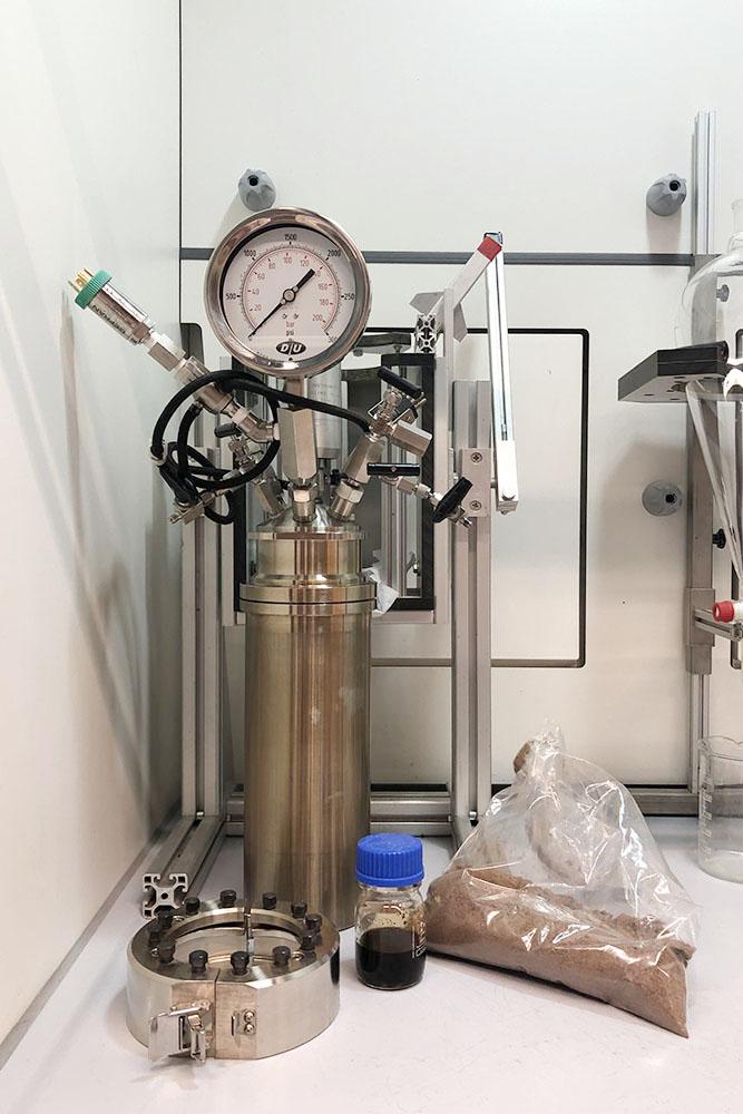 image: This picture displays the chemical reactor used in the study to split wood into wood pulp and lignin oil.