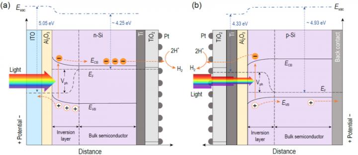 image: Schematic energy band diagrams of (a) illumination-reaction decoupled n-Si MIS photocathode and (b) traditional p-Si MIS photocathode for HER under illumination.