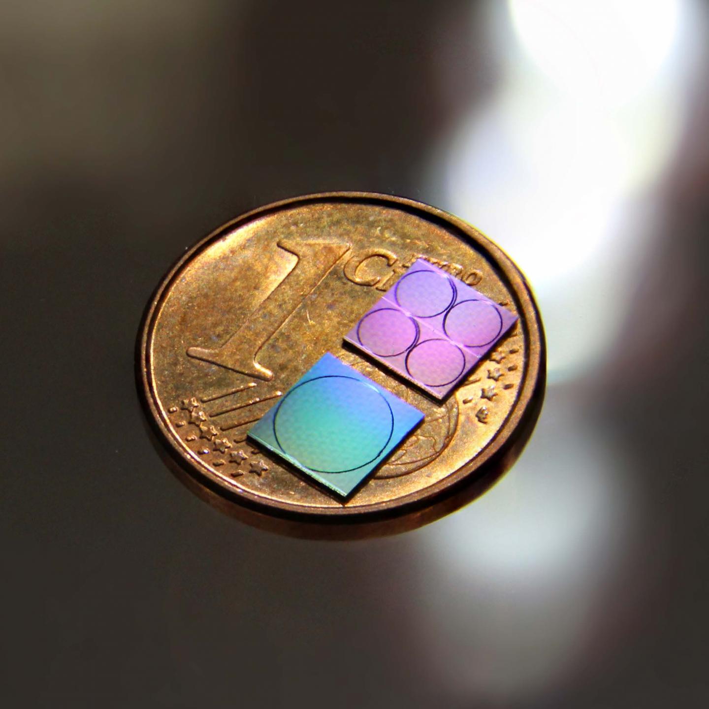 image: Photograph of the silicon nitride photonic chips used for frequency comb and photonic microwave generation.