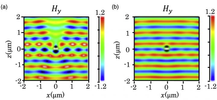 image: (a) Light with a wavelength of 700 nm traveling from bottom to top is distorted when the radius of the cylinder (in the middle) is 175 nm. (b) There is hardly any distortion when the cylinder has a radius of 195 nm. These images correspond to the conditions for invisibility predicted by the theoretical calculation.