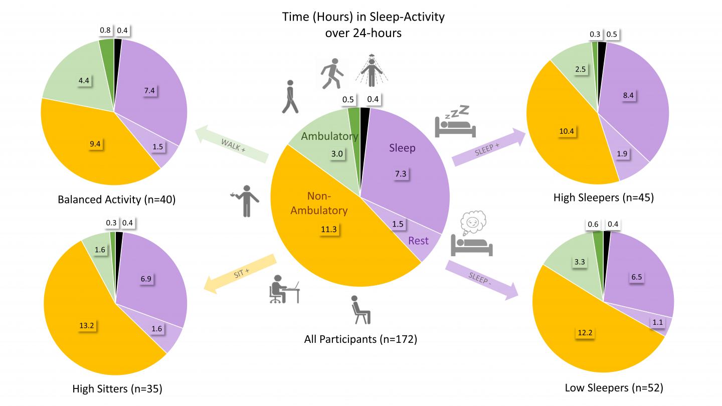 In the 172-participant study, four profiles were apparent with differences characterized by variations in time spent sleeping (High and Low sleepers), non-ambulatory activities (High Sitters), and ambulatory activities (Balanced Activity).