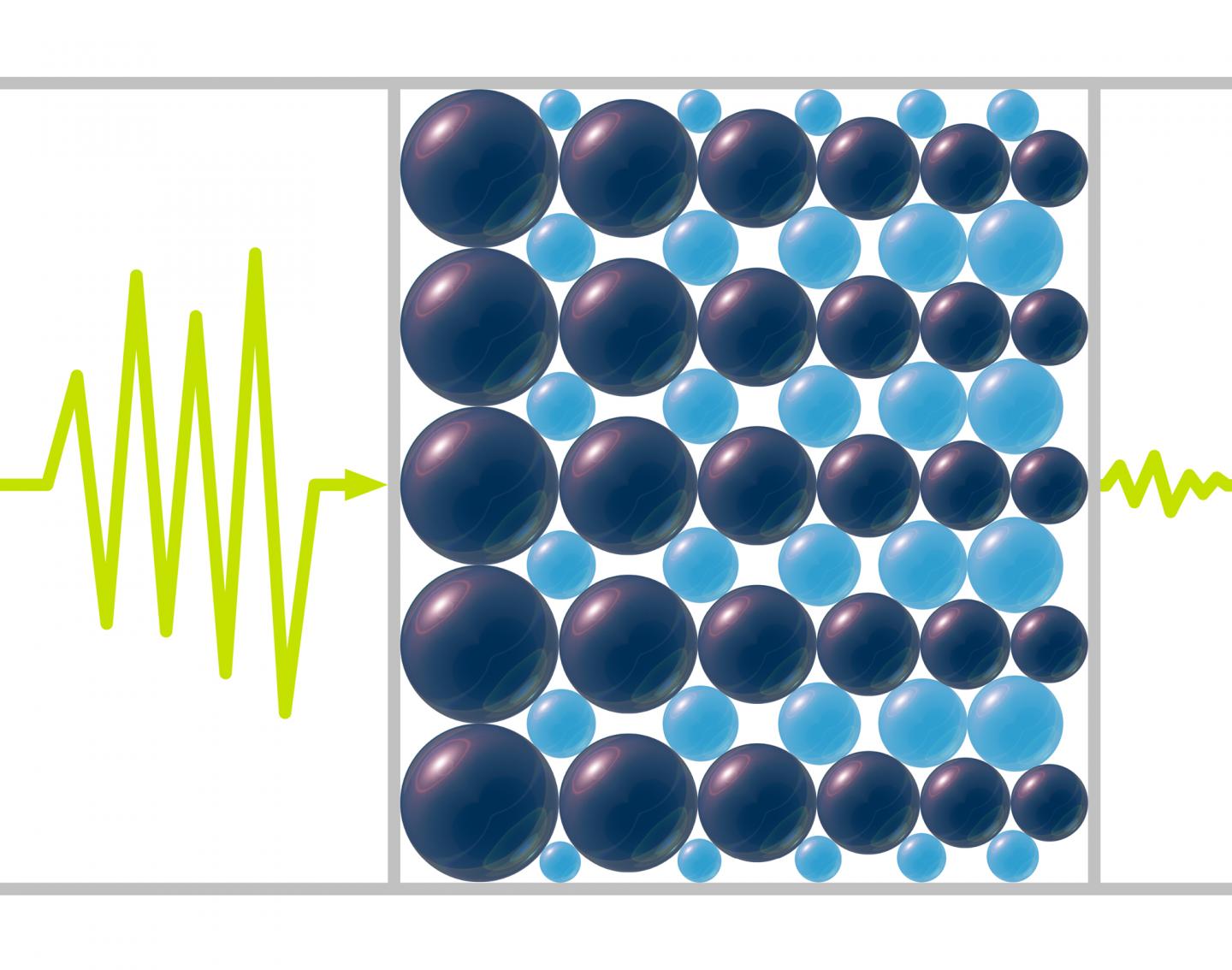 image: An artist's illustration of a system designed to help block high-frequency sounds of up to 20 kilohertz. The system comprises tapered chains of Delrin plastic beads (darker beads) alternating with tapered chains of tungsten carbide beads (lighter beads), surrounded by plastic walls.