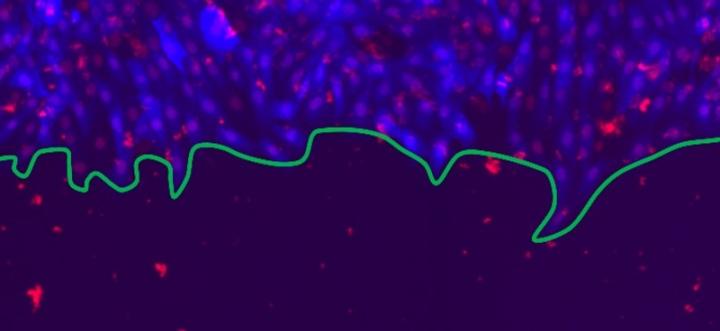 image: Fluorescent microscopy image of a proliferating cell front, whose edge is indicated in green. The rat epithelial cells, with cytoplasm (blue) and nuclei (red), form a 2-dimensional culture which can be used to model wound healing.