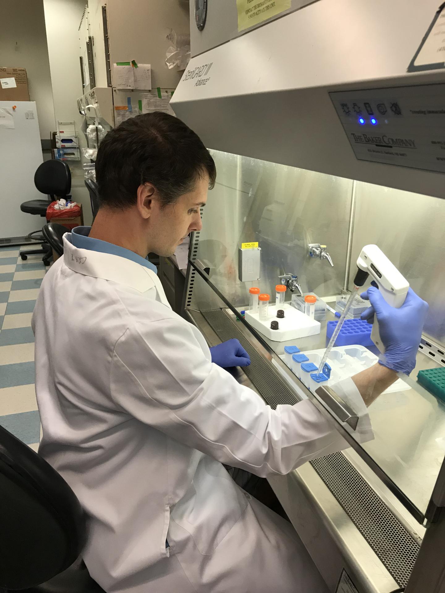 image: Investigator Bradley Downs assembling cartridge assay that distinguishes cancer from benign aspirates from mammographically suspicious breast lesions.