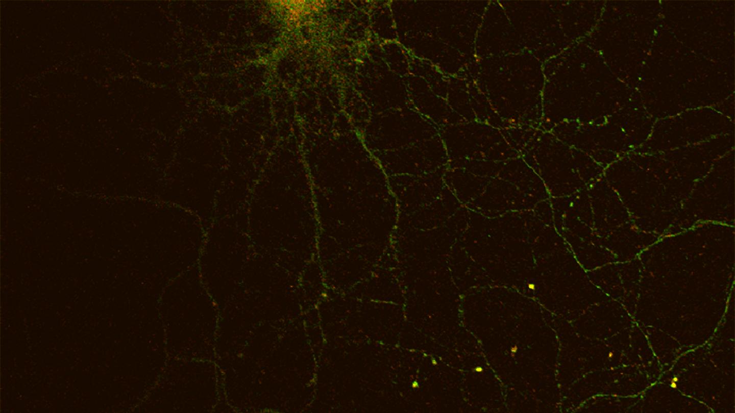 image: CPEB3 (green) localizing to a neuron's dendrites after stimulation.