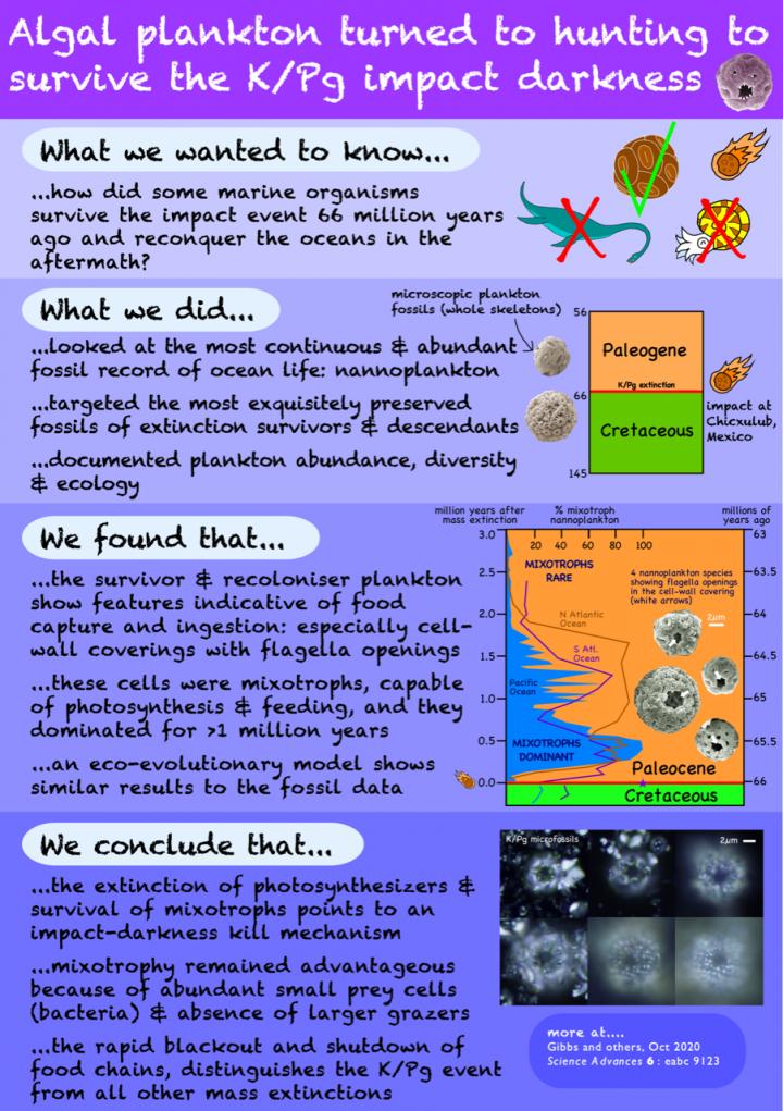 "Those species that were lost at the mass extinction show no evidence of a mixotrophic lifestyle and were likely to be completely reliant on sunlight and photosynthesis," explains Dr Samantha Gibbs of the University of Southampton. "Fossils following the Cretaceous-Paleogene (K-Pg) extinction show that mixotrophy dominated and our model indicates this is because of the exceptional abundance of small prey cells - most likely surviving bacteria - and reduced numbers of larger 'grazers' in the post-extinction oceans."