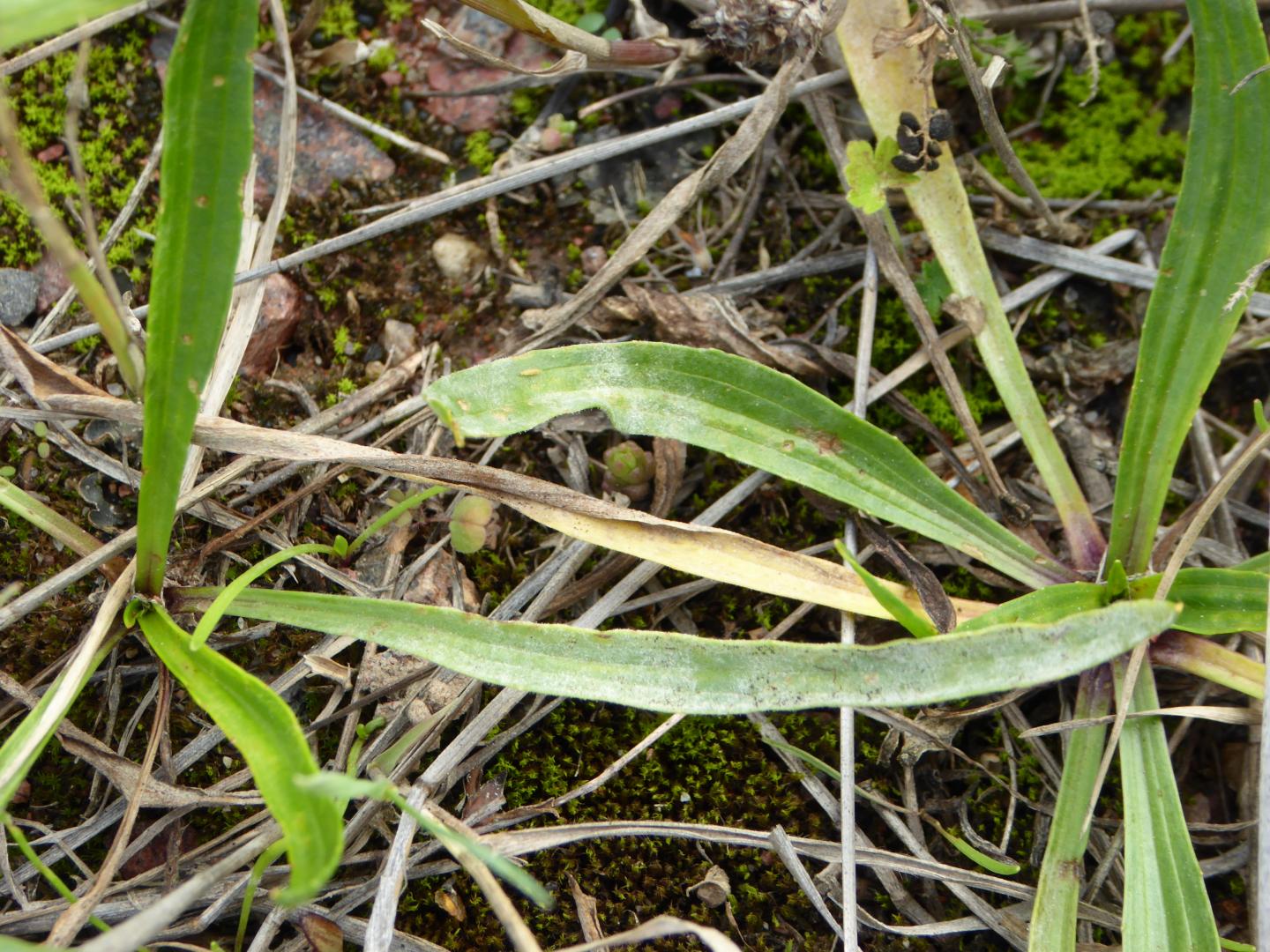 image: To the naked eye, the infection appears as white fungal spore growth covering the plant. A powdery mildew fungus is a common parasite of the ribwort plantain.