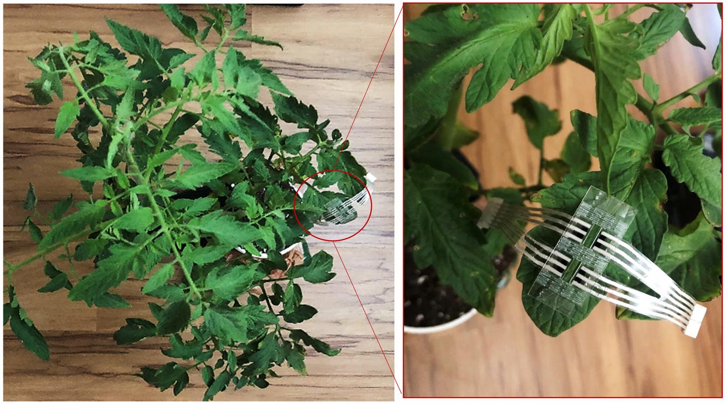 The researchers tested a prototype of the device on tomato plants. The prototype was set up to monitor for two types of stress: physical damage to the plant and infection by P. infestans, the pathogen that causes late blight disease in tomatoes. The system detected VOC changes associated with the physical damage within one to three hours, depending on how close the damage was to the site of the patch.