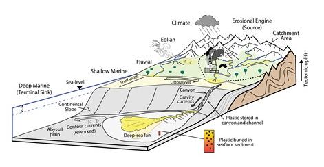 image: Pollutants, including plastic, reach deep-sea fans through linked sediment routing systems, as well as from outside the associated catchment(s), via near-shore and shelfal currents (i.e., littoral cells), eolian transport, surface currents, and direct input from oceanic sources such as shipping and fishing.