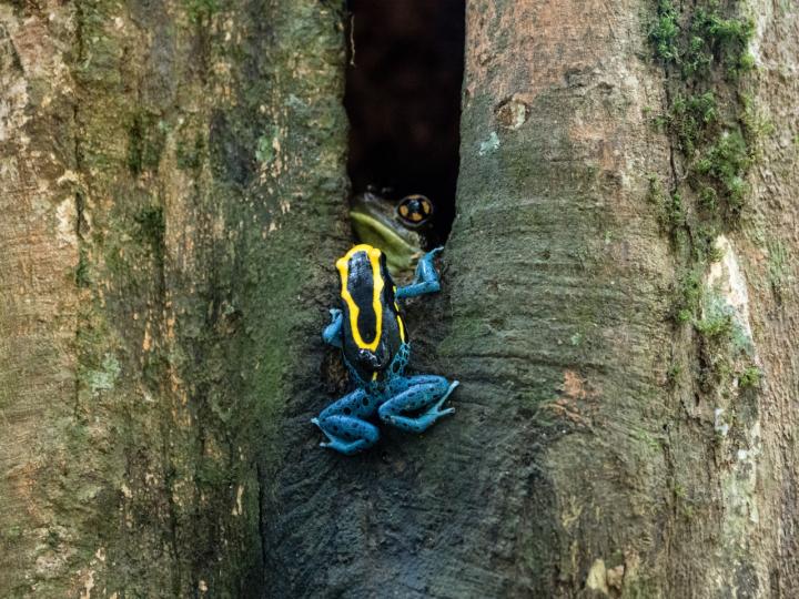 A group of researchers from the University of Jyvaskyla and Stanford University were part of an expedition to French Guiana to study tropical frogs in the Amazon. Various amphibian species of this region use ephemeral pools of water as their nurseries, and display unique preferences for specific physical and chemical characteristics. Despite species-specific preferences, researchers were surprised to find tadpoles of the dyeing poison frog surviving in an incredible range of both chemical (pH 3-8) and vertical (0-20 m in height) deposition sites. This research was published in the journal Ecology and Evolution in June 2021.