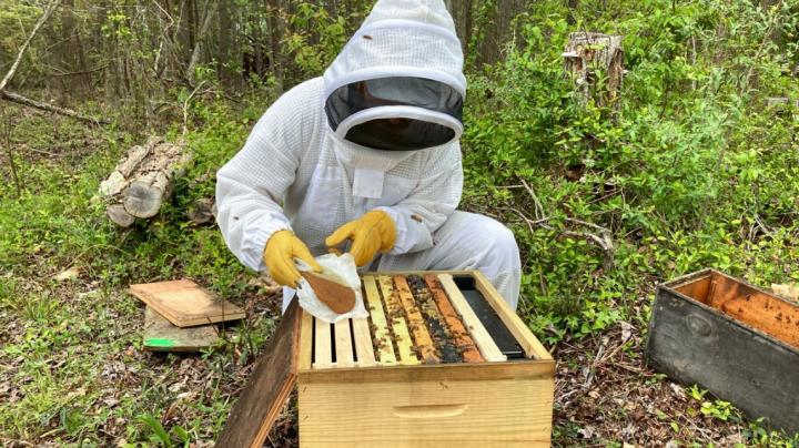 image: A Beemmunity employee, Abraham McCauley, applies a pollen patty containing microsponges to a hive as part of colony trials.