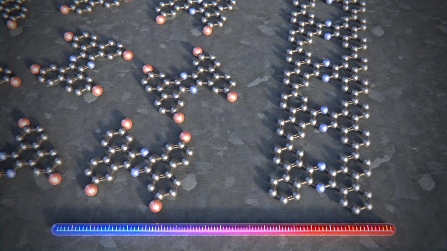 image: The individual building blocks are heated on a silver surface in order to synthesize a porous graphene ribbon that exhibits semiconducting properties and a ladder-like structure. In each rung of the ladder, two carbon atoms have been replaced with nitrogen atoms (blue).