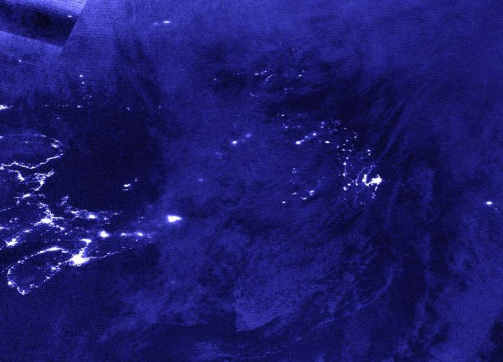 The Visible Infrared Imaging Radiometer Suite (VIIRS) instrument aboard Suomi NPP provided a nighttime image of Post-Tropical Storm Teddy over Newfoundland, Canada. The image was taken at 1:40 a.m. EDT (0540 UTC) on Sept. 24. The nighttime lights of Newfoundland can be seen somewhat through Teddy's clouds, and the nighttime lights of Nova Scotia were visible, revealing that Teddy had moved past the province.