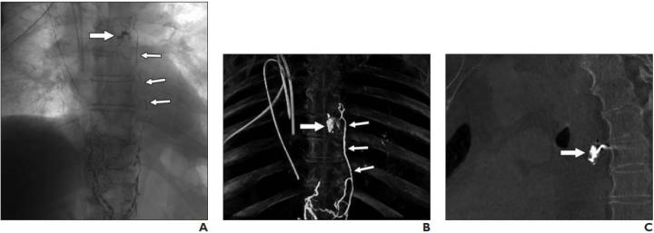 image: Plain thoracic radiograph (A), maximum intensity projection of cone-beam CT image (B), and sagittal cone-beam CT reconstruction (C) show ethiodized oil (Lipiodol Ultra Fluid, Guerbet) extravasation (thick arrow, A-C) projected at left main bronchus 6 days after esophagectomy and thoracic duct ligation were performed. Extravasation is supplied by mediastinal collateral lymph vessels (thin arrows, A and B).
