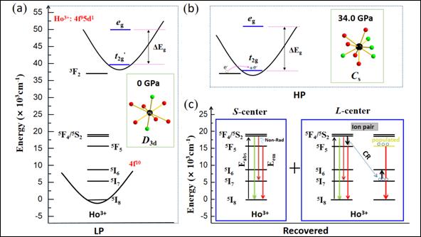 "Our further analysis on crystal and electronic structure revealed that the centrosymmetric site symmetry of Ho3+ change to non-centrosymmetric during structural change at high pressure," explained Dr. Yongsheng Zhao. "This enhanced the hybridization of Ho3+ electron orbitals and thus brings in the emerging of tricolor PL. And the enhanced PL in amorphous state comes from the energy-exchange between the two Ho3+, which stimulates one more emission center in the quenched sample."