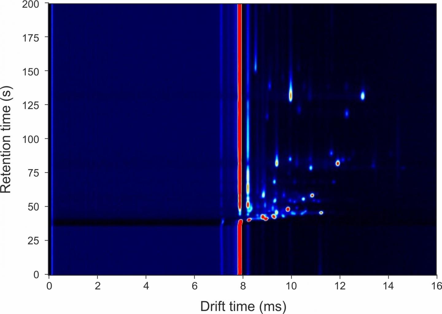 image: Figure showing typical GC-IMS output to a vaginal swab. Red spots indicate individual chemicals and machine learning identifies which of these chemicals hold discriminatory information.