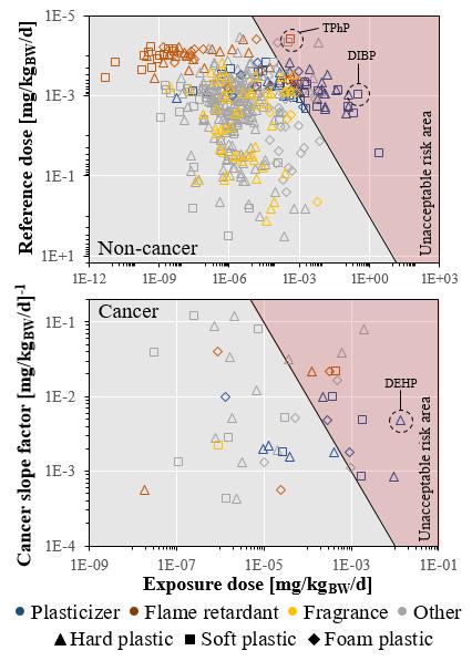 "Out of 419 chemicals found in hard, soft and foam plastic materials used in children toys, we identified 126 substances that can potentially harm children's health either via cancer or non-cancer effects, including 31 plasticizers, 18 flame retardants, and 8 fragrances. Being harmful in our study means that for these chemicals, estimated exposure doses exceed regulatory Reference Doses (RfD) or cancer risks exceed regulatory risk thresholds (all substances in the 'red zone' of below figure). These substances should be prioritized for phase-out in toy materials and replaced with safer and more sustainable alternatives," says Peter Fantke, Professor at DTU Management and the study's principle investigator.