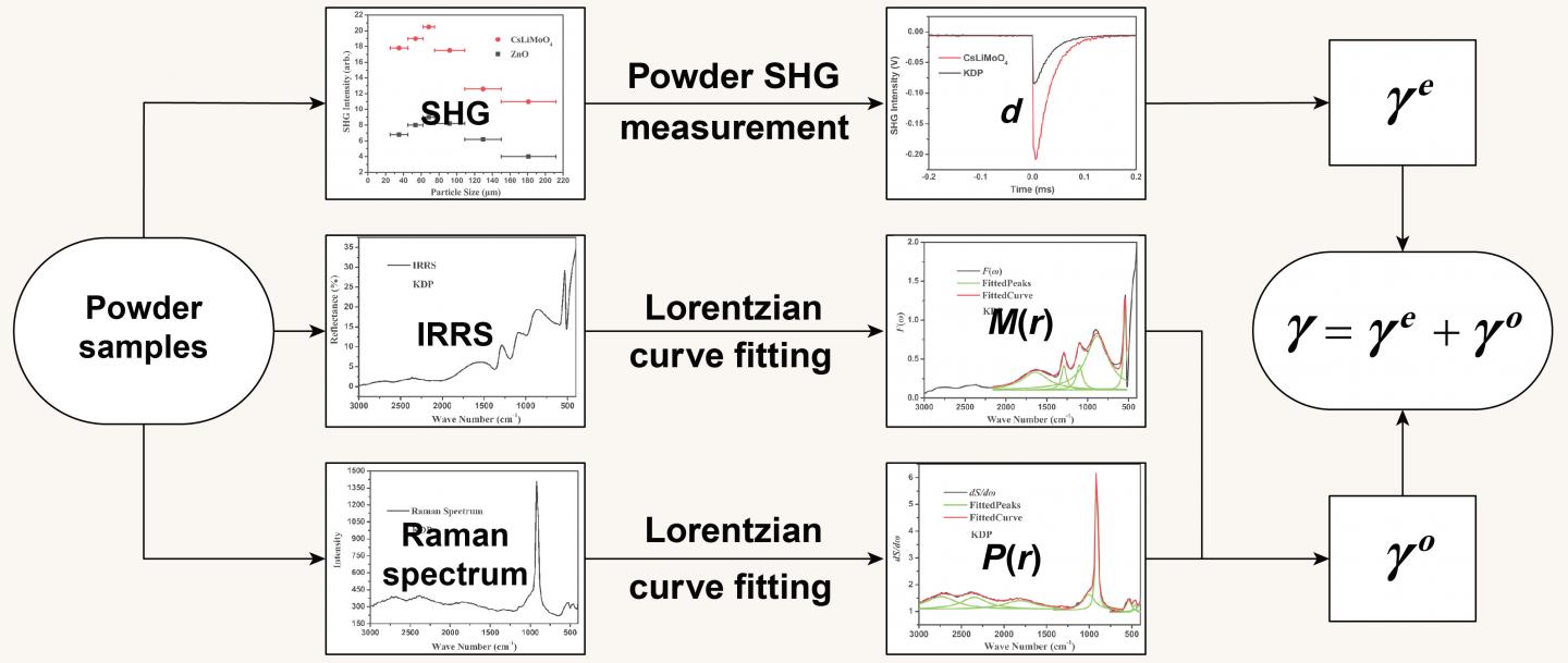 image: Schematic illustration of the powder method using powder SHG measurement, IRRS, and Raman spectrum