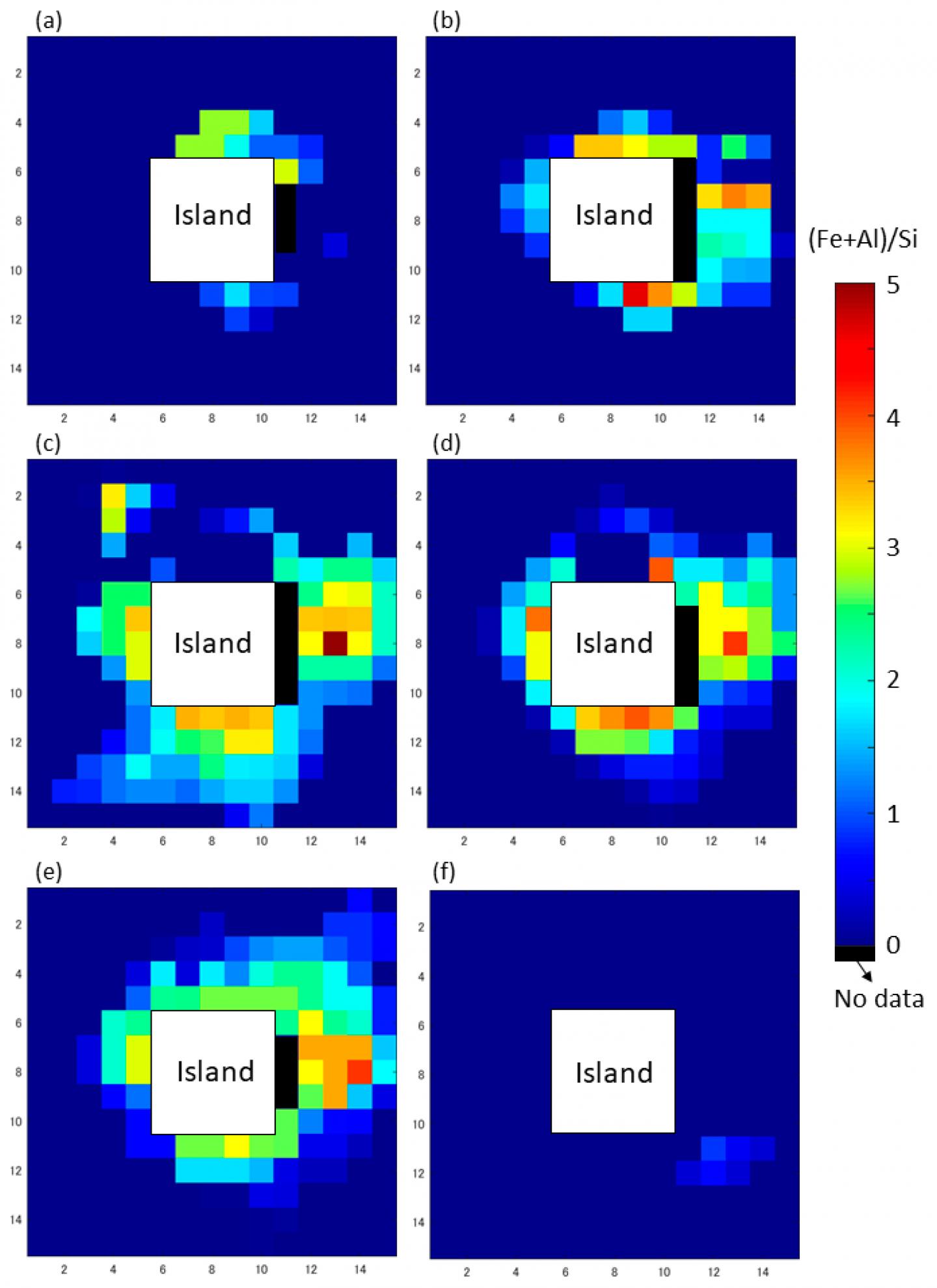 image: This photo shows a sample of the (Fe + Al)/Si distribution as a volcanic activity index from May 16 to June 25 around Nishinoshima Island: (a) May 16-23, 2020, (b) May 24-31, 2020, (c) June 1-8, 2020, (d) June 9-16, 2020, (e) June 17-24, 2020, (f) June 25-July 2, 2020. It is mapped by applying the equation ((Fe+Al)/Si)=45.4(x)?13.3 to the SGLI data. From this, it can be seen that during this period, the distribution on the northeastern part of the island rises, and then the discoloration gradually progresses to the sea area around the island, before it disappears. Nishinoshima Island is located approximately 1,000 km south of Tokyo, Japan. The original data used for this product have been supplied by JAXA's JASMES (JAXA Satellite Monitoring for Environmental Studies).