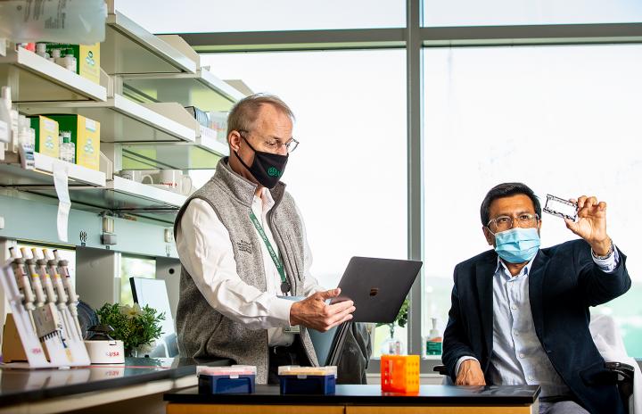image: (L-R) Dartmouth and Dartmouth-Hitchcock's Norris Cotton Cancer Center Director Steven D. Leach, MD, and Surajit Dhara, PhD, Senior Research Scientist in the Leach laboratory are about to bring change to the treatment of pancreatic cancer with a novel biomarker technology that predicts chemotherapy response and potential benefit of epigenetic therapy in patients with pancreatic cancer.