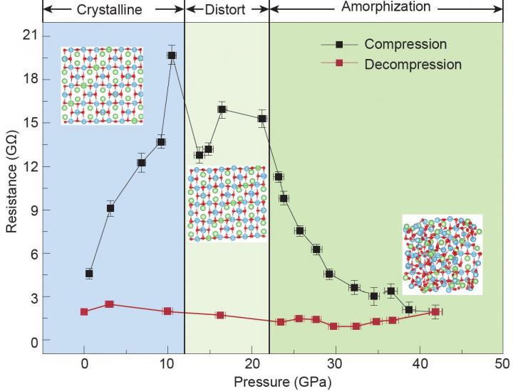 image: The resistance of LTO changes with increasing and decreasing pressure, the insets show the corresponding structures at different pressure regions. It indicates that LTO undergoes crystalline-distortion-amorphous transitions under high pressure. The resistance increases at lower pressures during the lattice distortion, then it starts to decrease sharply as amorphization takes place at higher pressure. The amorphous LTO can be decompressed down to ambient pressure and has much better conductivity compares with the crystalline LTO.