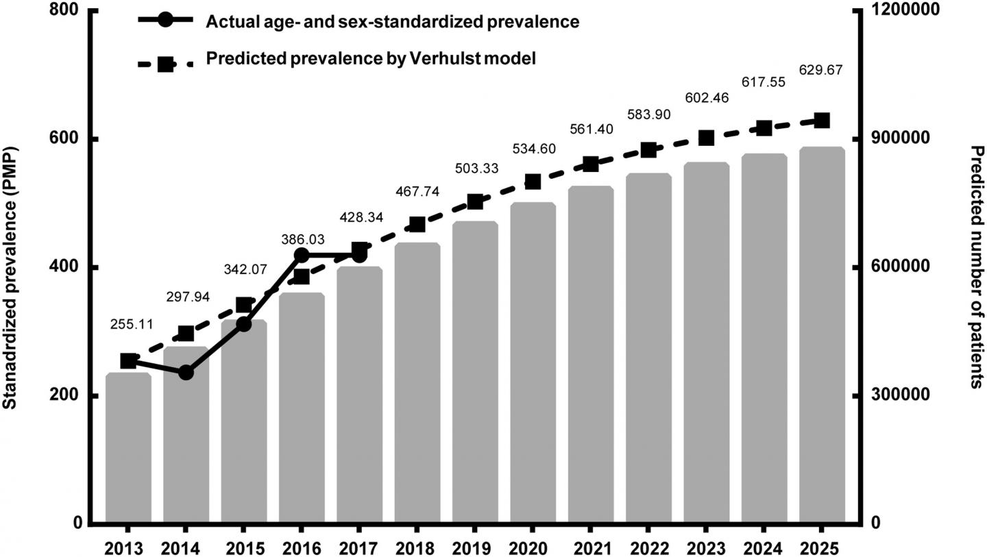 image: Prediction curve of prevalence and number of dialysis patients in China from 2013 to 2025. Note: The age- and sex-standardized prevalence was calculated by the direct method using the 2010 national population census data. The numbers and columns in the figure show predicted prevalence and predicted number of patients using the grey Verhulst model, respectively. Abbreviation: PMP, per million population.
