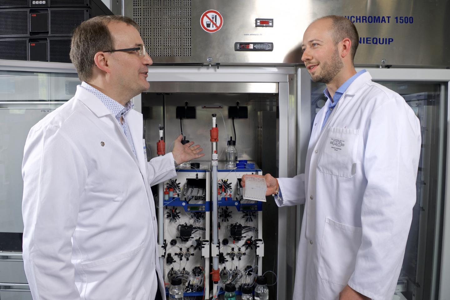 image: Steffen Brünle (right) and Jörg Standfuss at the apparatus they use to separate proteins from each other. For their study, the researchers modified insect cells to produce a human protein. To extract this from the cell, the cell was destroyed, and then the protein, whose structure the researchers have now elucidated, was separated with the help of this apparatus.