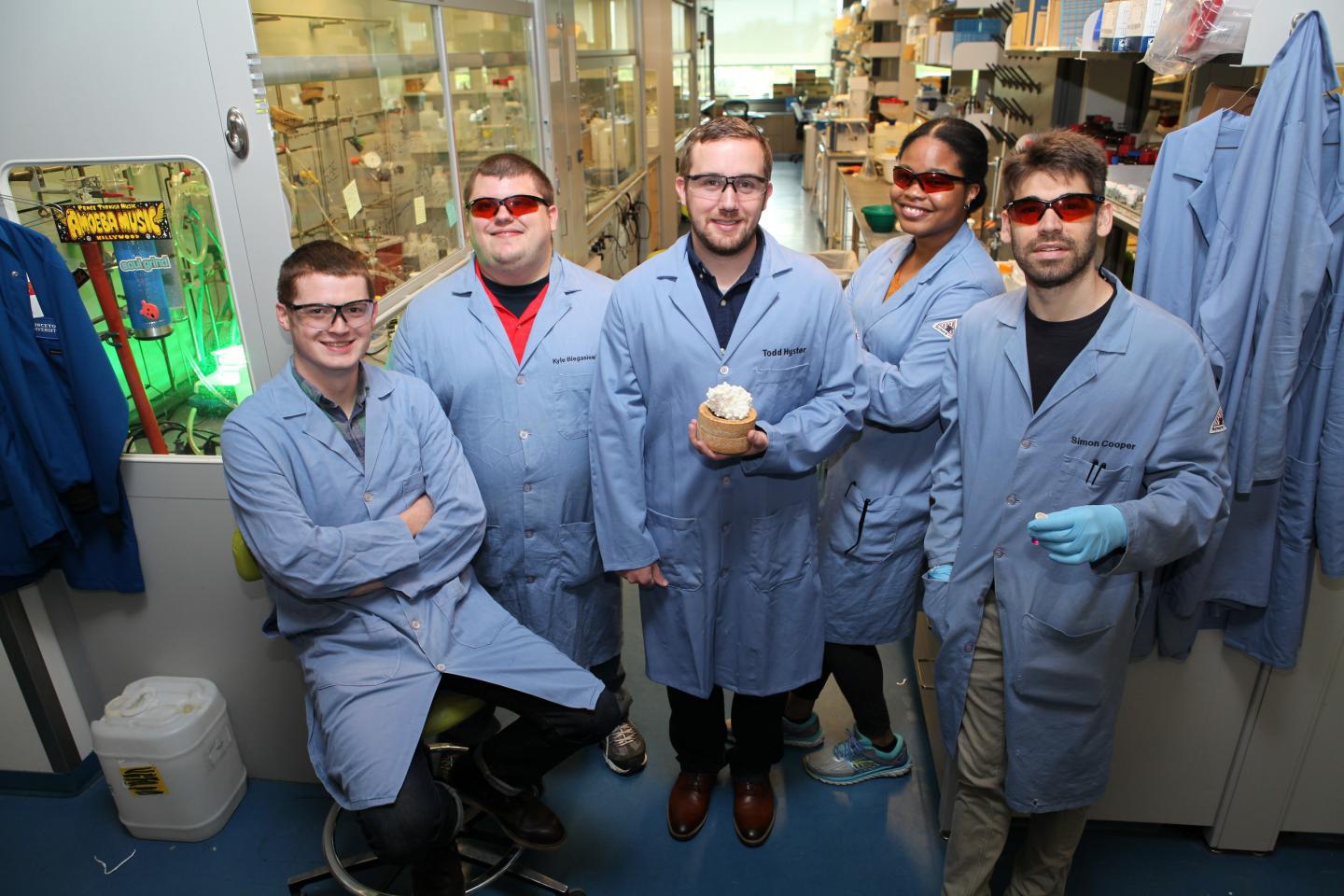 image: Todd Hyster's research group at Princeton University has found a way to make a naturally occurring enzyme take on a new, artificial role. From left: David Miller, postdoctoral researcher; Kyle Biegasiewicz, postdoctoral researcher; Todd Hyster, assistant professor of chemistry, holding a 3-D printed model of the enzyme; Megan Emmanuel, graduate student; Simon Cooper, graduate student.