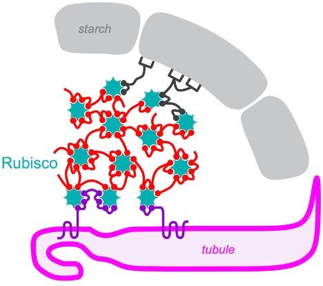 To visualize a pyrenoid, think of a pomegranate. The pyrenoid contains kernels of Rubisco, the enzyme that carries out the molecular work of incorporating carbon dioxide into sugars. These kernels are embedded in a supportive flesh, or matrix, of other proteins, that is itself surrounded by an outer shell made of starch. The fruit is a bit worm-eaten; it is riddled with fingerlike channels -- actually, tubules enclosed by membrane -- that deliver concentrated carbon dioxide to the Rubisco kernels. The tubules are important to pyrenoid function because waterborne algae such as Chlamydomonas reinhardtii would otherwise struggle to get enough carbon dioxide to keep Rubisco operating at peak capacity.