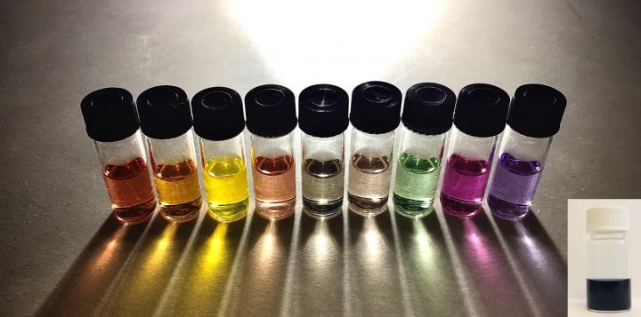 image: The polymer dots in the black solution (inset image) can absorb more light, and show better photocatalytic properties, than the single-component polymer dots in the coloured solutions.