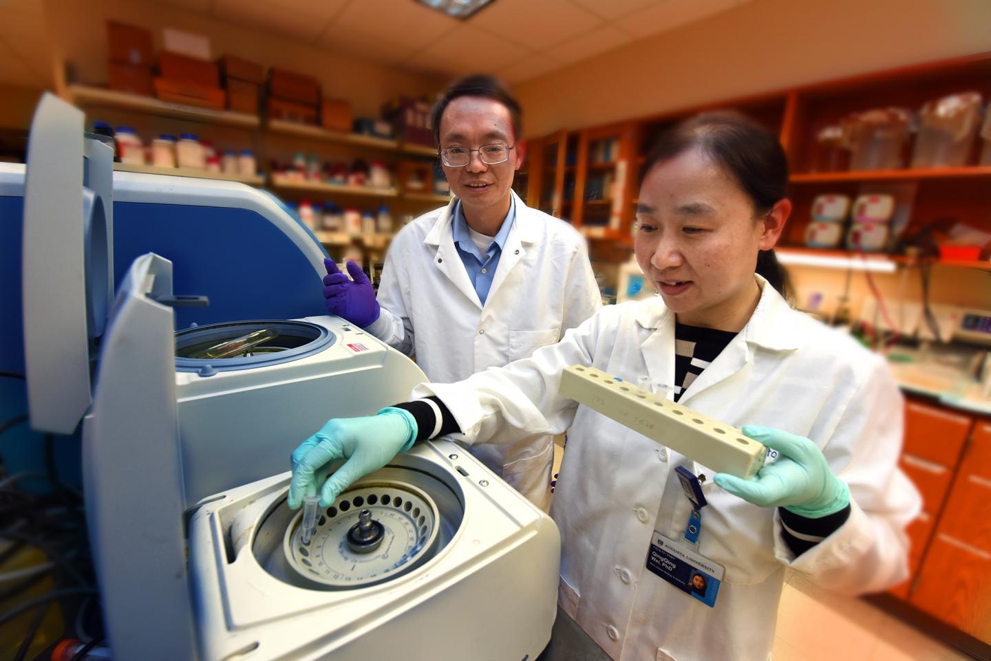 image: Drs. Zheng Dong and Qingqing Wei in the Cellular Biology Anatomy lab at the Medical College of Georgia at Augusta University