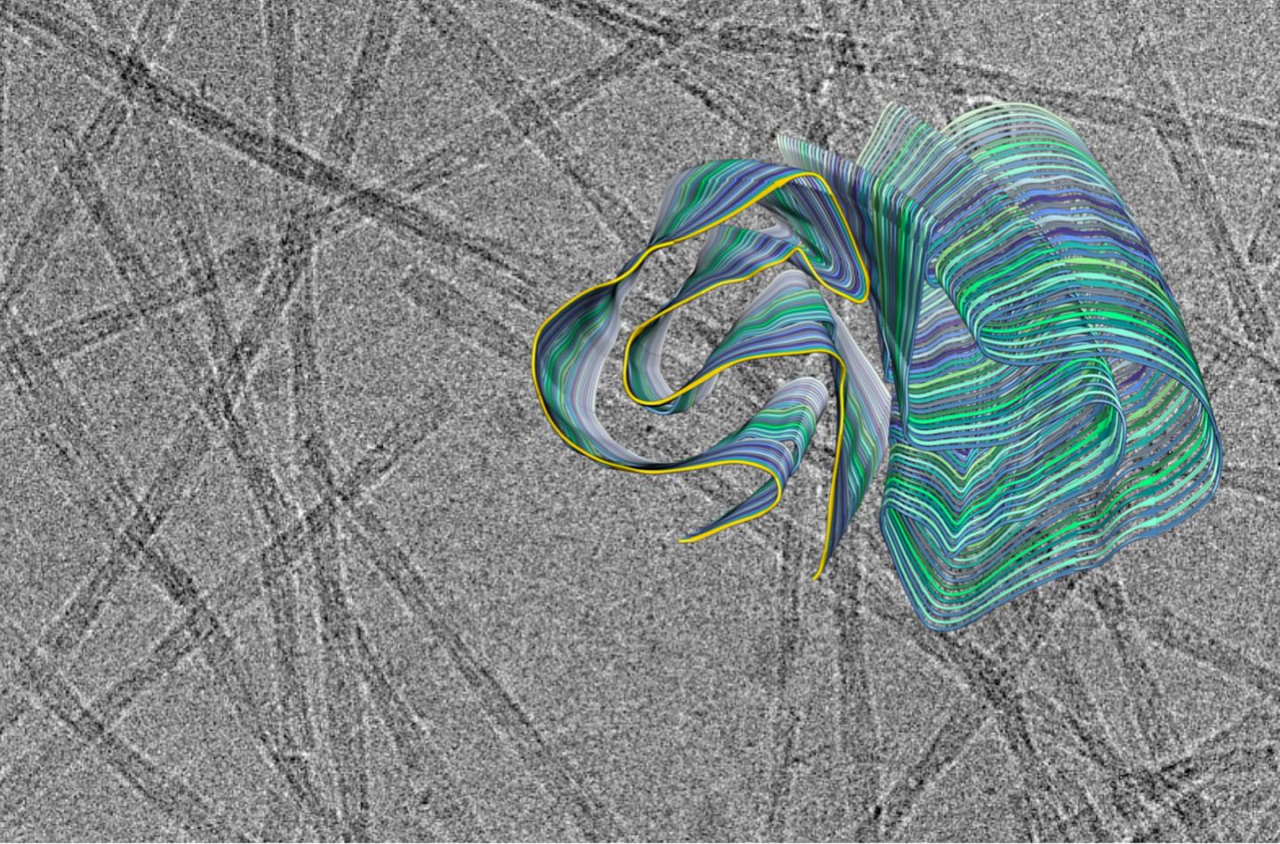 image: Cross section of the 3D model of an amyloid fibril against the backdrop of a cryo-electron microscopy recording. A PI3K SH3 domain is highlighted in yellow.