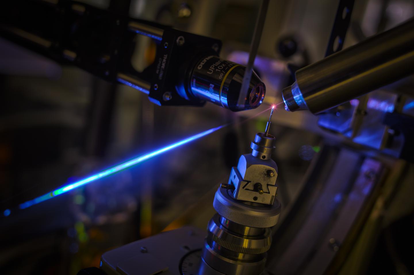 image: A crystal of a red fluorescent protein placed in a combined instrument consisting of a fluorescence microscope and an X-ray diffractometer. The crystal glows red when illuminated by a blue laser beam.