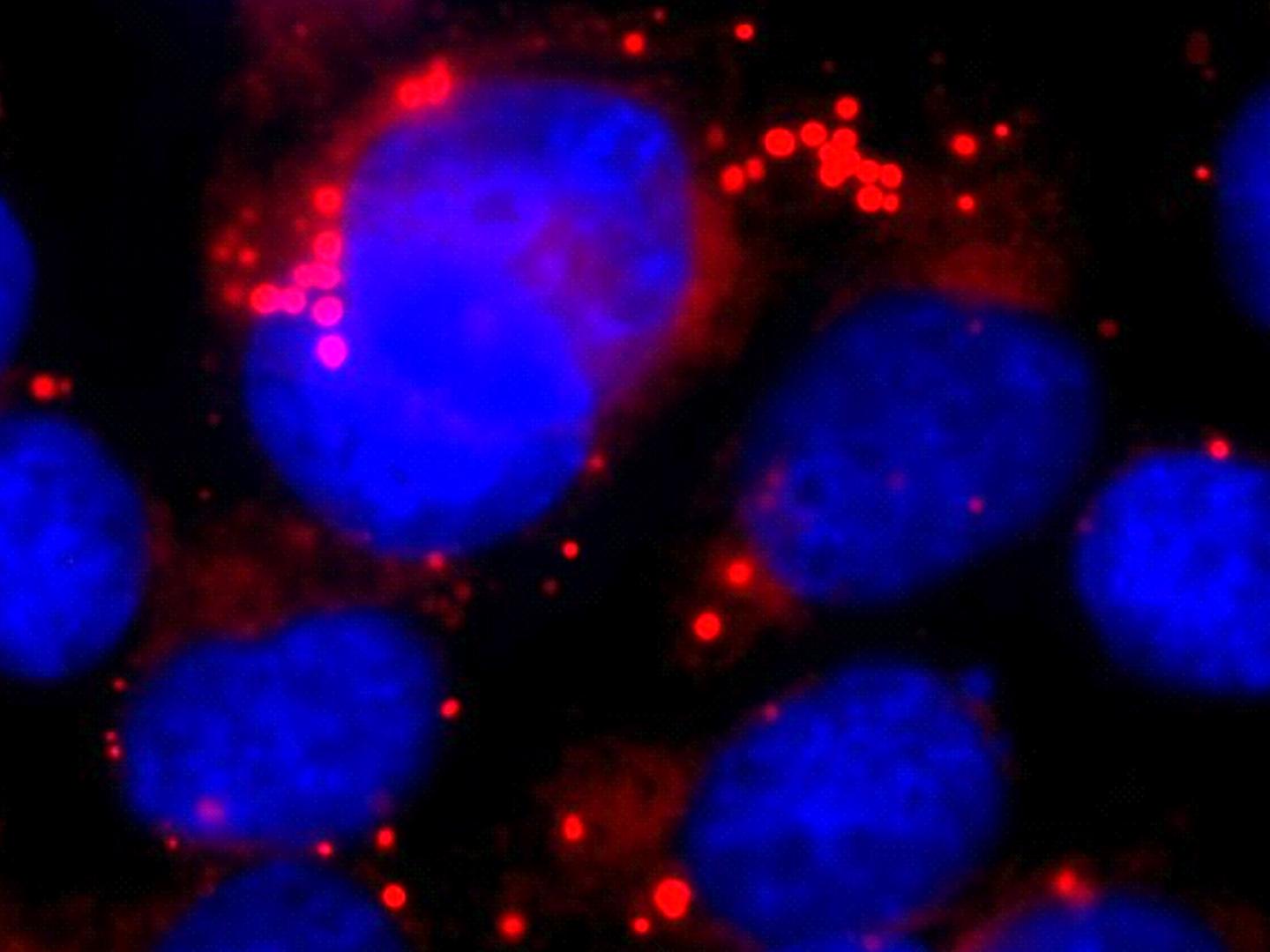image: After inhibition of secretase, the examined brain cells, the astrocytes (their cell nucleus is stained blue), accumulate large quantities of lipid droplets (red). These disrupt the normal cell function.