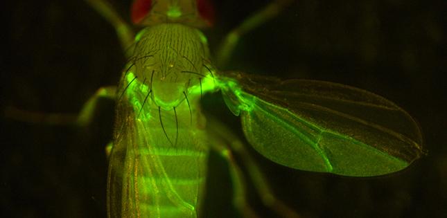 image: Compartments in adult tissues. Fluorescent protein expression shows posterior compartments in the wing and the abdomen. Please notice that boundaries between compartments are amazingly straight.