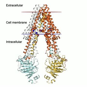 video: The ABCB1 protein squeezes fat-soluble compounds out of the cell through a major twist in the protein structure.