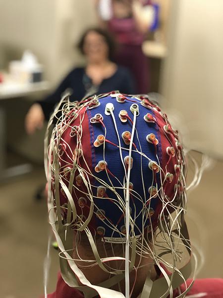 image: Purdue University researchers are doing work at the intersection of artificial intelligence and neuroscience. In this photo, a research participant is wearing an EEG cap with electrodes.