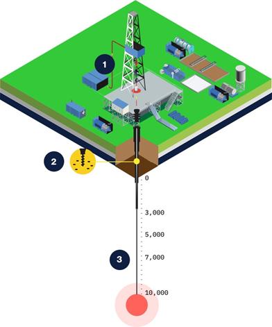 image: Simplified schematic of the Quaise drilling rig: (1) millimeter wave drilling components interfaced with conventional drilling rig at the surface, (2) Conventional drilling from surface down to basement rock, (3) millimeter wave drilling from basement down to target depth. Source: Quaise Inc.