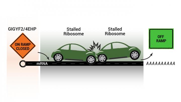 "Imagine that the protein assembly process is a highway and the ribosomes are cars traveling on it," Kostova explained. "If there's a bad message producing incomplete protein products, it's like having a stalled car or two on the road, clogging traffic. Think of GIGYF2 and 4EHP as closing the on-ramp, so that there is time to clear everything away and additional cars don't get stalled, exacerbating the problem."