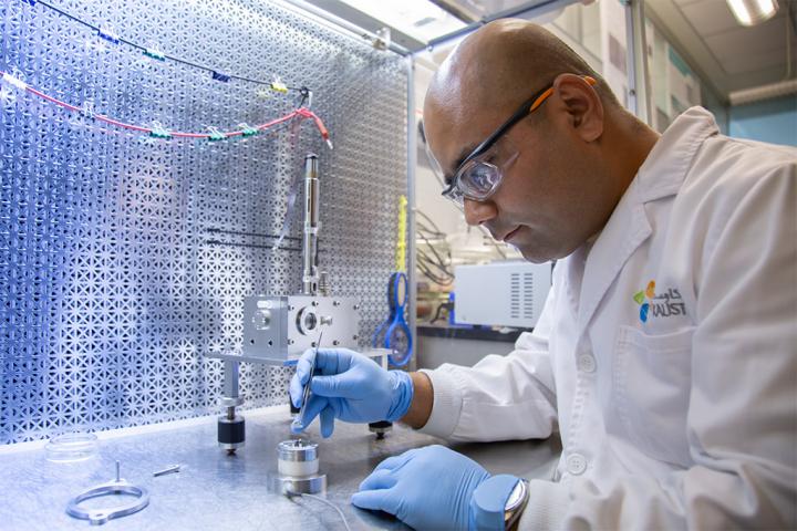 image: Buddha Shreshtha loads a silica disk with an ultrasmooth-surface terminated with per fluorocarbons comprising 10 carbon atoms.