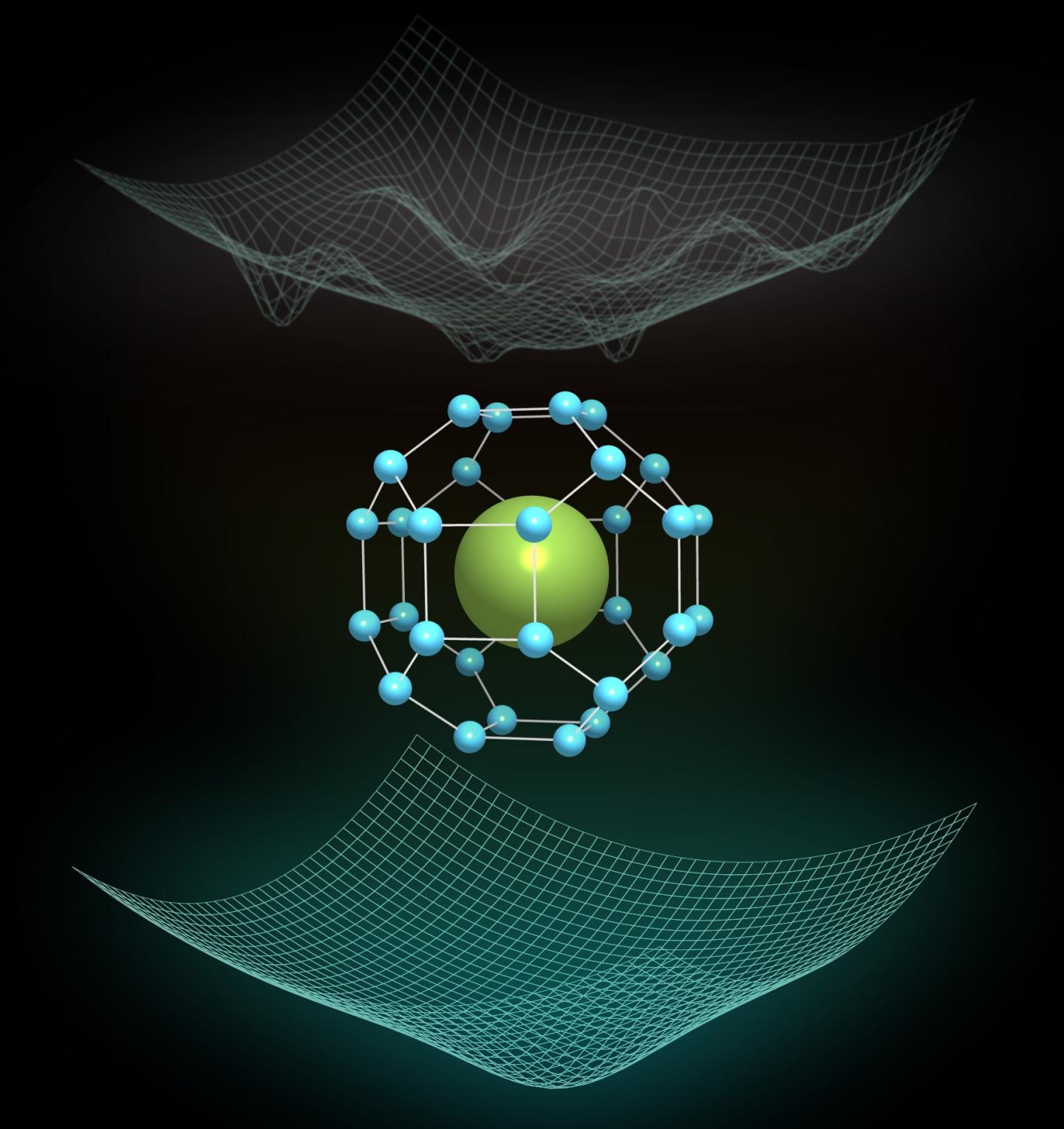 image: Crystal structure of the Fm-3m phase of LaH10, where a highly symmetric hydrogen cage encloses the lanthanum atoms. In the top a sketch of the complex classical energy landscape is shown, where many minima are present. On the other hand, in the bottom we see a sketch of the completely reshaped much simpler quantum energy landscape, where only one minimum survives.