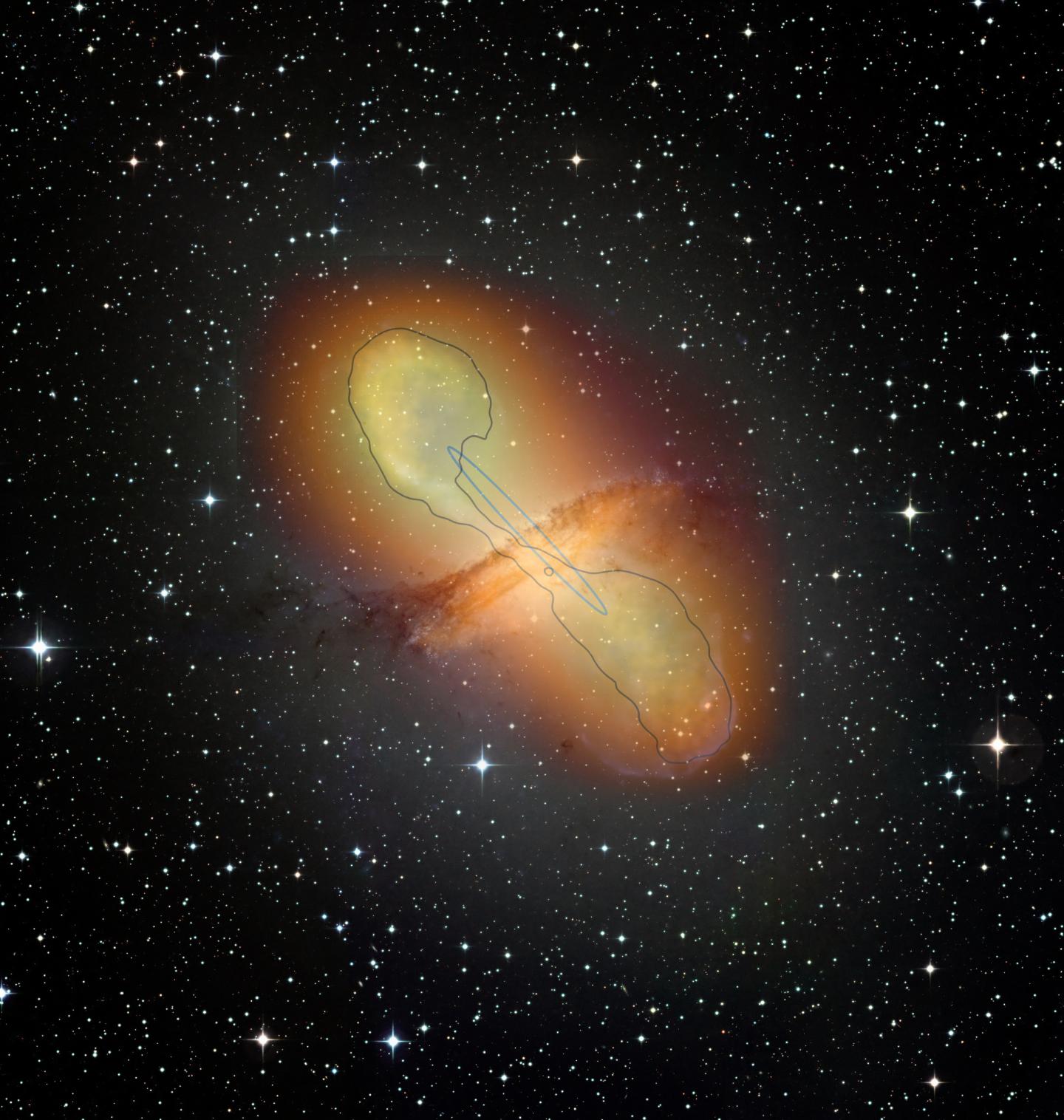 image: Composite image of Centaurus A, showing the jets emerging from the galaxy's central black hole, together with the associated gamma radiation.