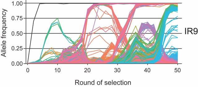 image: This graph depicts when different mutations (colored lines) entered and left one of the four E. coli populations in the study, all the way up to cycle 50. Lines that make it all the way to the top are then present in 100% of the population. Some mutations don't quite make it there and are then outcompeted by different mutations that do a better job at conferring resistance.