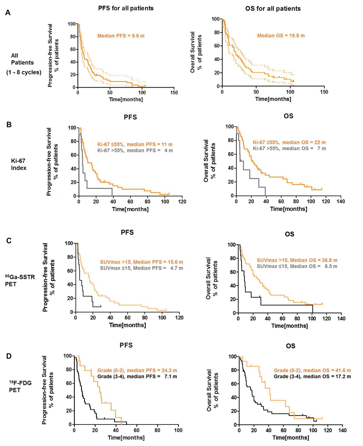 image: Kaplan-Meier curves for progression-free survival (PFS) and overall survival (OS) (in months) from start of PRRT for all patients with G3 NENs (A), and in subgroups with Ki-67 index of ? 55% and Ki-67 index of > 55% (B), in subgroups with SUVmax cutoff of >15 and SUVmax cutoff of ? 15 on baseline 68Ga-SSTR PET imaging (C) and in subgroups with grade 0-2 and grade 3-4 on baseline 18F-FDG PET imaging (D).