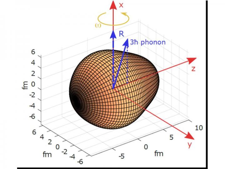 image: Cartoon illustrating how the octupole phonon vector aligns with the rotation (R) vector (which is orthogonal to the rotating body's symmetry axis) so that I?=?R?+?3? and Δi.