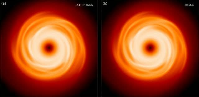 video: Video showing the comparison of a protoplanetary disc's evolution without a planet (left) and with an orbiting 3 Jupiter mass planet (right).